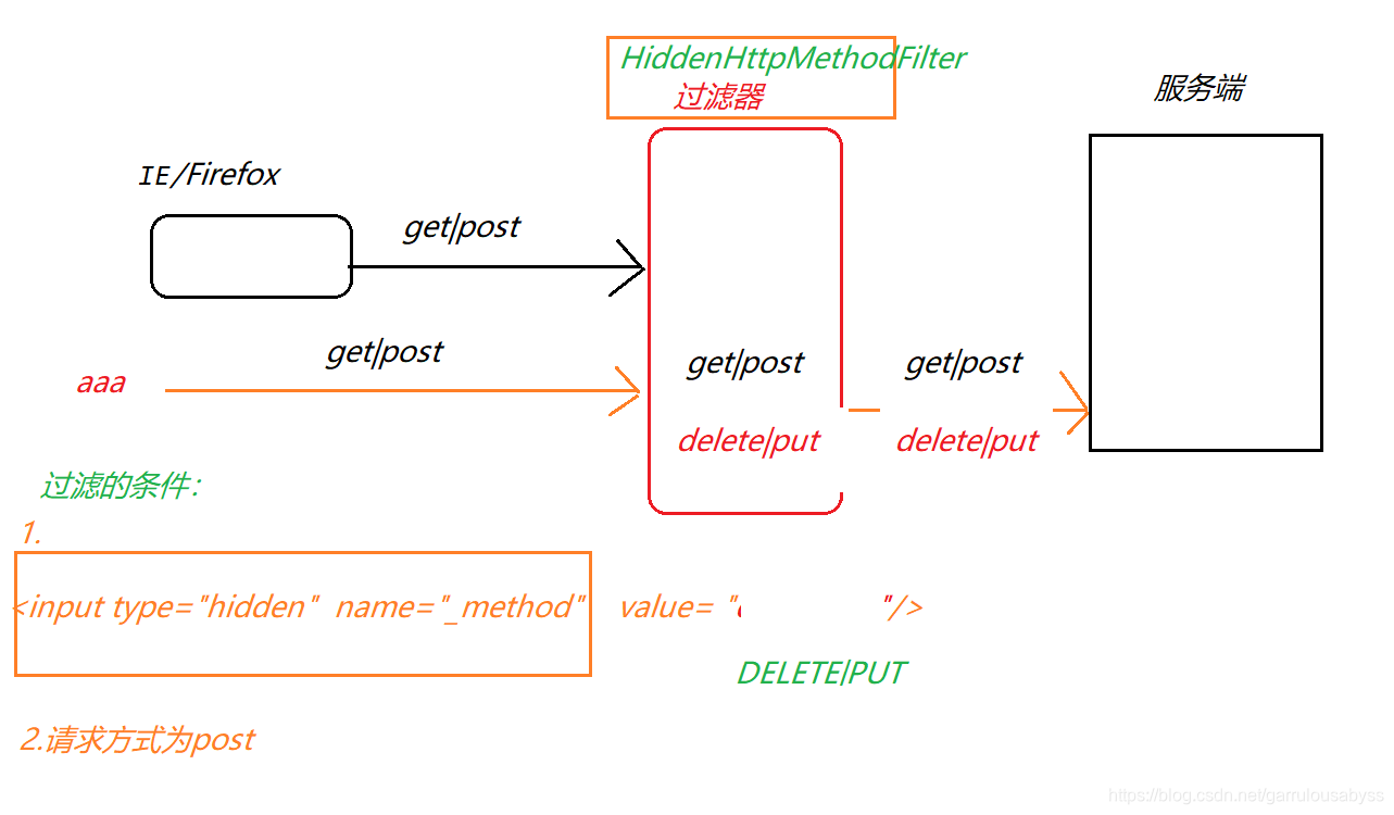 GET :查 POST :增 DELETE :删 PUT :改普通浏览器 只支持get post方式 ;其他请求方式 如 delelte|put请求是通过 过滤器新加入的支持。
